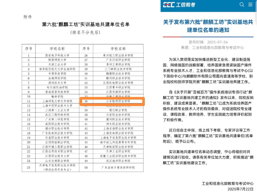 工业和信息化部教育与考试中心与麒麟软件有限公司近日联合公布第六批"麒麟工坊"实训基地共建单位名单,山东胜利职业学院凭借优质的建设方案成功入选,跻身国家级信创产教融合平台共建高校行列。自《关于开展"百城百万"操作系统培训专项行动"麒麟工坊"实训基地共建工作的通知》发布后,我校智能制造学院依托工业互联网应用高水平专业群组建专项工作组。在校长助理兼智能制造学院院长刘岩的统筹下,项目团队深入解读信创产业标准...