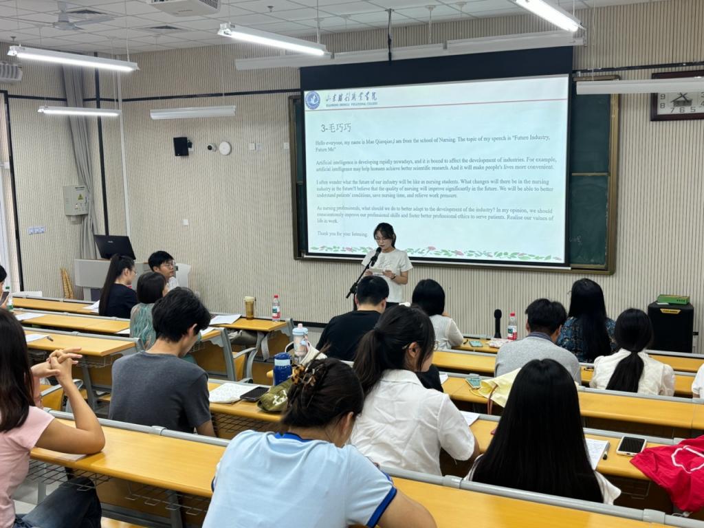 本次活动得到了学校各级领导的高度重视和大力支持。国际学院外语教研室教师担任主持和评委。比赛现场,选手们围绕主题各抒己见,从人工智能、绿色能源到生物科技、康养护理,演讲内容新颖、视角独特。参赛选手不仅展现了扎实的英语语言功底和卓越的演讲技巧,更体现了当代青年对未来产业发展的深刻思考。整个赛场气氛热烈,掌声不断,选手们自信从容的表现,充分展现了我校学子积极向上的精神风貌。比赛现场,荆晓燕主任针对选手演讲内容进行了现场提问,通过即兴问答环节深入考查选手的临场应变能力和思维深度。这一环节既增加了比赛的挑战性,也更好地展现了选手们的综合素养。