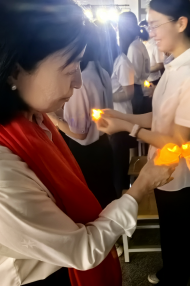 烛光依次亮起。40位老教师手持蜡烛,转身面向120位青年教师。烛光虽弱,却照见了教育者代代相传的信念与温度。老教师代表深情地说道:“孩子,你看这烛光。它温和、坚定,能驱散黑暗,带来温暖和希望……今天,我将它传给你。你,可愿接过这份光亮?”