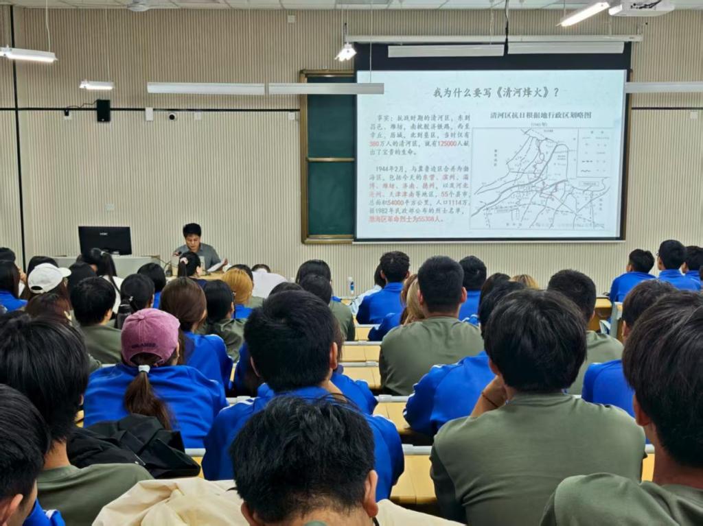 本次宣讲特邀山东省电影家协会编剧、东营市东营区方志馆馆长、东营市作协副秘书长、东营区作协副主席王文勃担任主讲人。王馆长以《清河烽火》为主题,以其深厚的史学功底和饱含深情的讲述,为全体师生再现了清河地区广大革命先辈,在中国共产党的积极领导下,同仇敌忾、浴血奋战,开展抗日武装起义、粉碎日伪扫荡的峥嵘岁月。