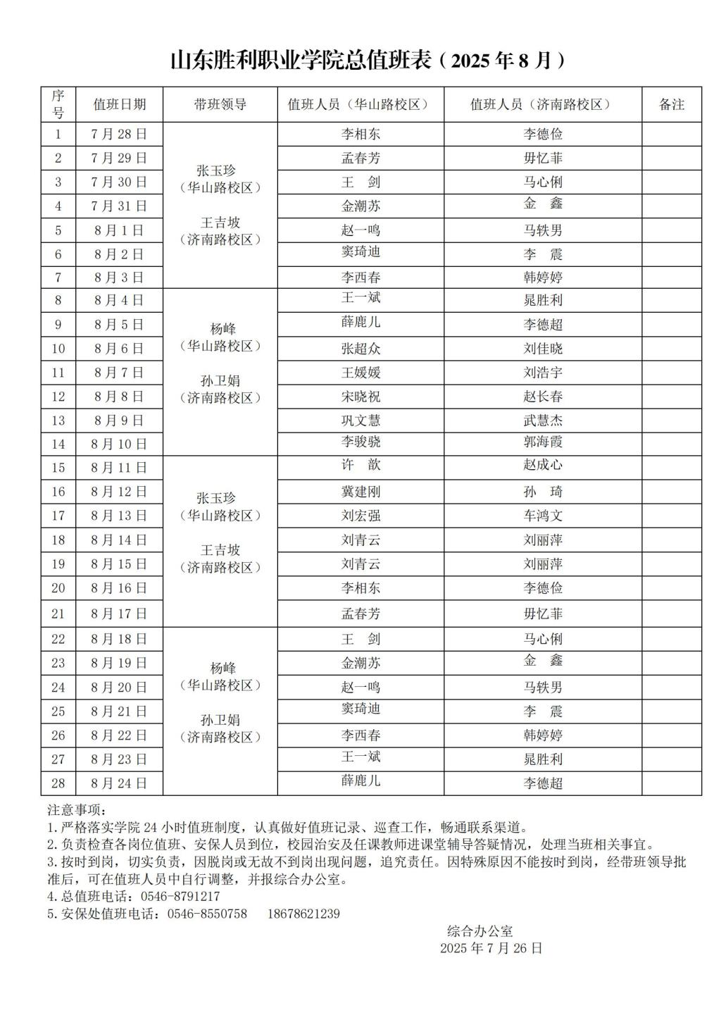 山东胜利职业学院8月份值班表