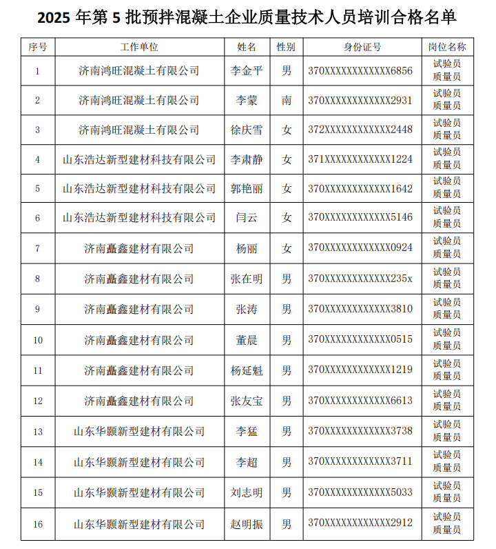 2025年第5批预拌混凝土企业质量技术人员培训合格名单